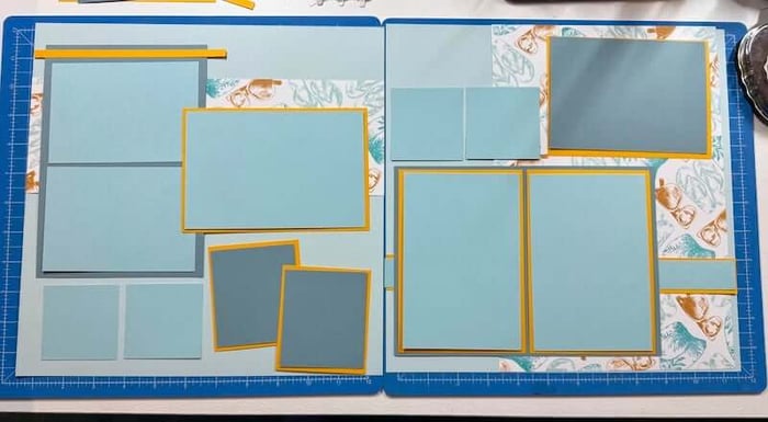 Add the remaining photo mats and panels to the two base papers. Test-fit the photos over the mats until you're happy with the arrangement.