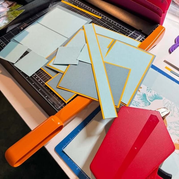 Cut and sort the 12x12" papers: Med. Blue (Paper A), Custom White "Print" (Paper B), Gold (Paper C), and Dk. Blue (Paper D) with a paper trimmer*.