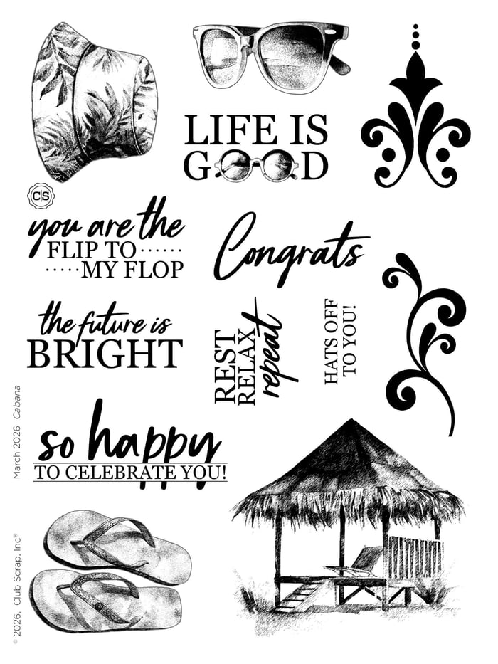 I love that our clear stamps are made right in the USA and am so "impressed" with how the half-tones and shading worked out on this month's images. (See what I did there?) It's hard to choose a favorite between the hat, flip-flops, sunglasses, or little beach hut! Learn more about my stamped cards later this month on the blog where I'll give you a full video tour of my stamp explorations!