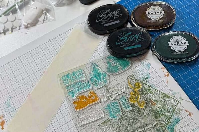 Gather a variety of Club Scrap Hybrid Inks, stamps, and blank address label stickers* and let's get crafting!