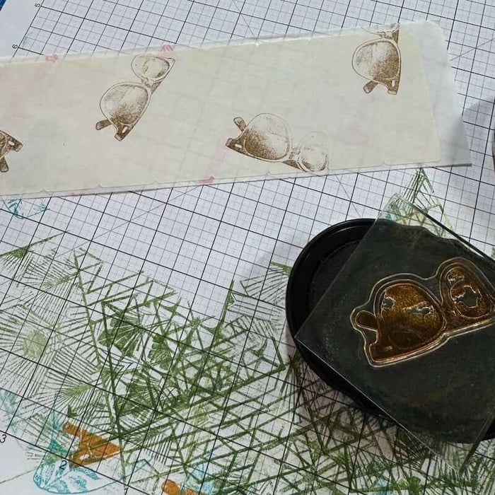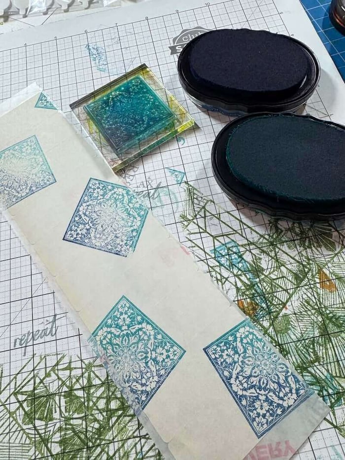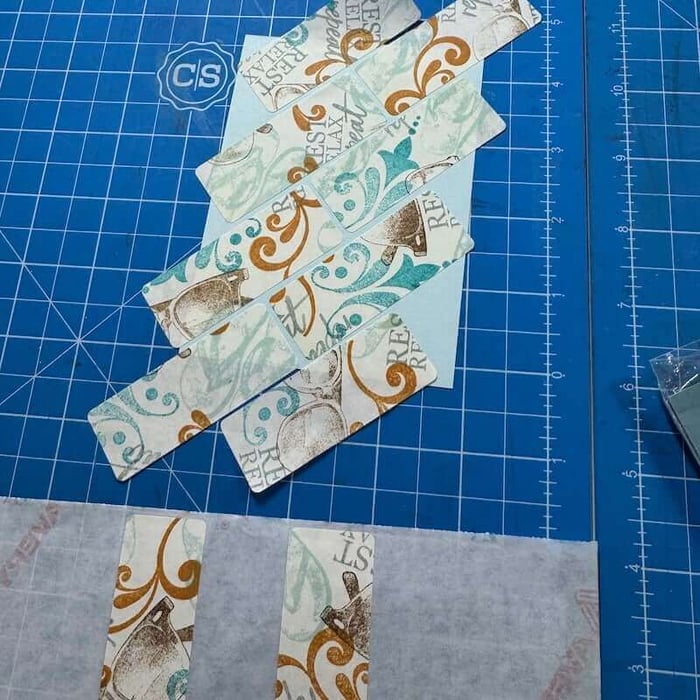 Start with one image; ink and stamp it repeatedly onto the entire strip, making sure to rotate the image in different directions after each application.