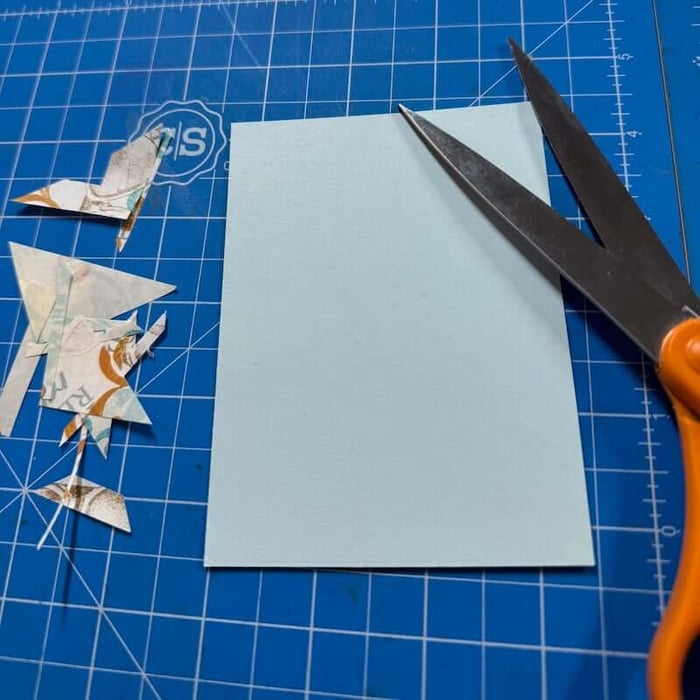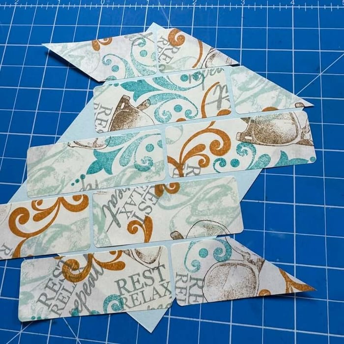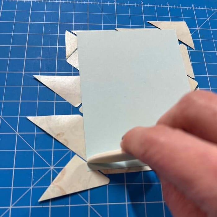 Place a 3-1/2x4-3/4" Lt. Blue panel on the work surface. Peel a sticker from the backing sheet and adhere to the panel on the diagonal. (Be sure to leave a small gutter between each sticker as shown.)