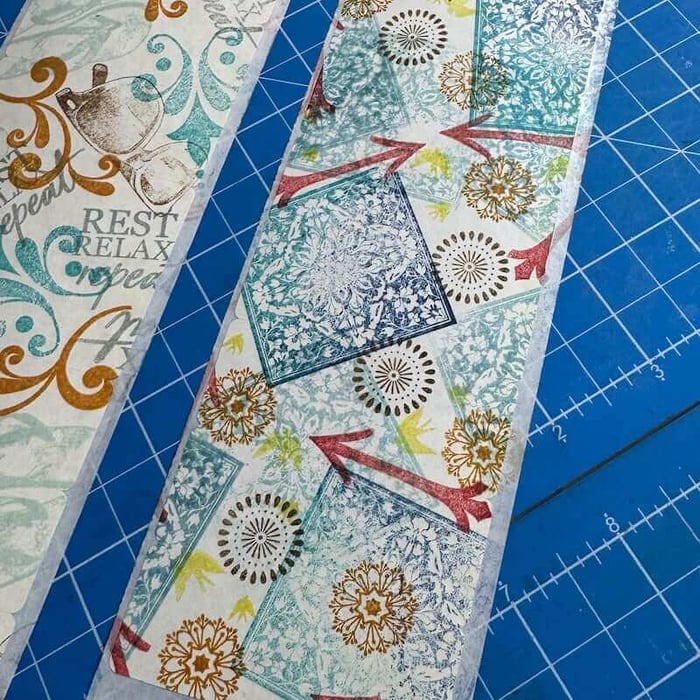 Create a strip of Collage Stickers with Tunisian Tiles stamps (07.25) and a variety of inks; I used a mix of Red, Ocean, Sapphire, Earth, and Yellow.