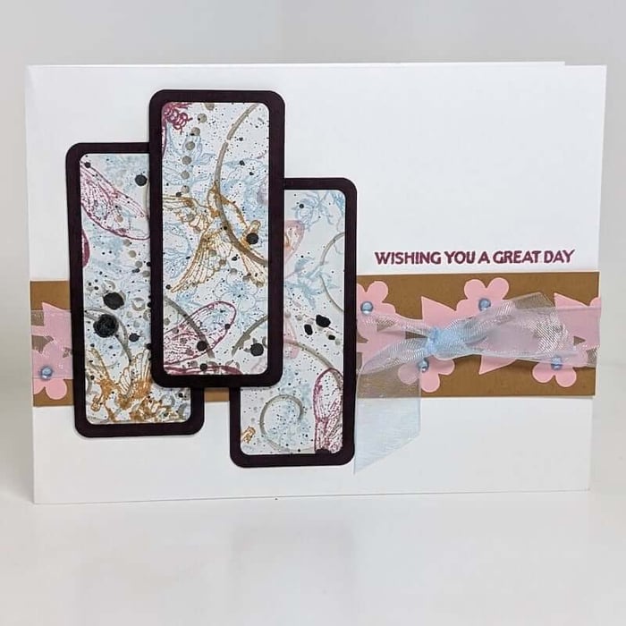 Mat each sticker with Black; round the corners with a punch. Position the sticker trio over a Brown anchoring strip (embellished with die cut flowers and ribbon); adhere with foam adhesive. Finish with a sentiment (Impressed 11.25) stamped with Wine ink.