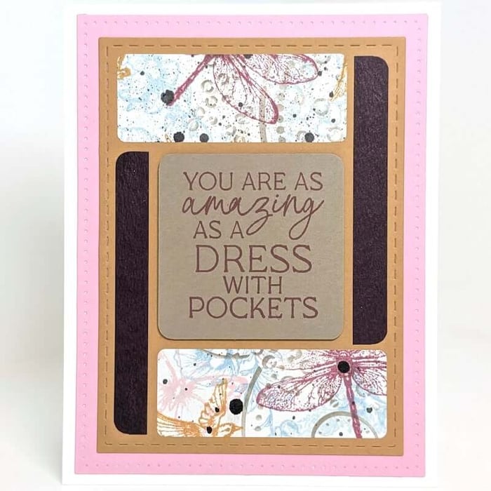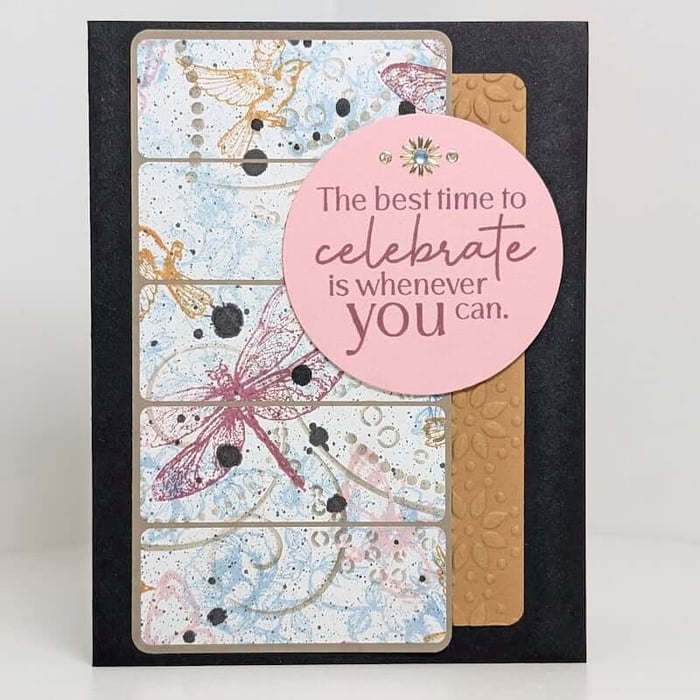 Add a sentiment (Vines 08.24) to a die cut circle with Wine ink. Embellish with perfectly placed Dazzle stickers. Create a collage with a dry-embossed brown panel to complete the card.