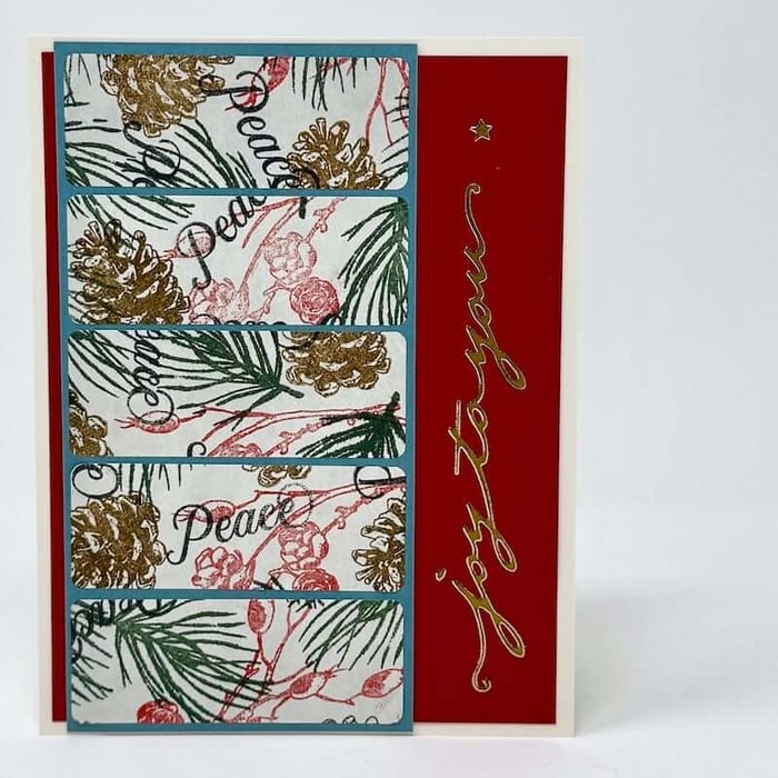 Create a strip of collage stickers with Boughs of Joy stamps inked with Red, Spruce, Earth and India Black.