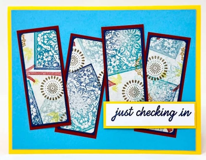 The collage stickers balance the "quilted" panels to perfectly frame the stamped sentiment (Vines 08.24) in Lisa's final card sample.