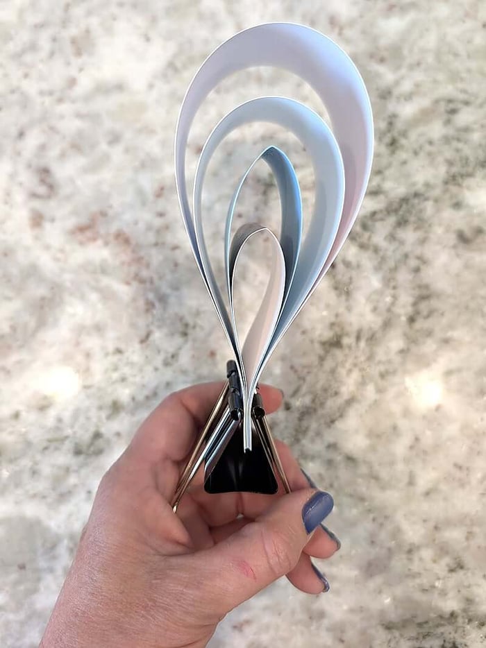 Start with the smallest strip (6"). Apply a small amount of Bookbinding Glue to one inside edge, carefully bend the paper to adhere the two inside ends together to form a tear drop shape. Hold them in place until they’re fully adhered (a binder clip is helpful with this).