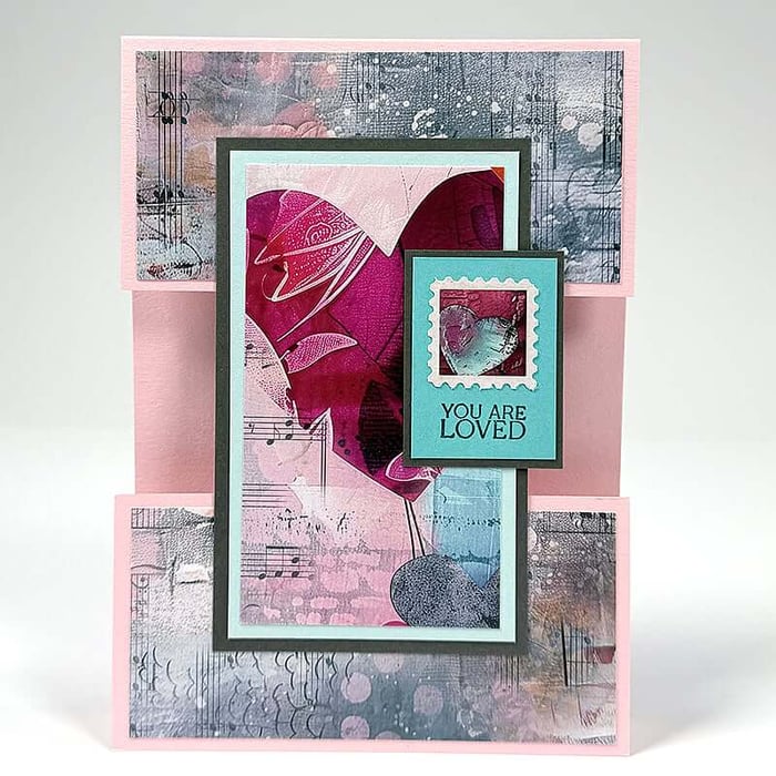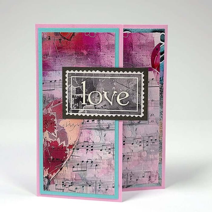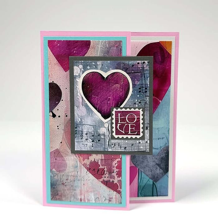 Trim the edges of the small "love" cutapart to mimic a postage stamp. Mat with a Dk. Gray scrap and add to the front panel with a heart cutapart.