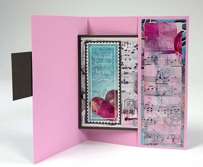 Create a collage on each vertical card panel using cutapart artwork and sentiments.