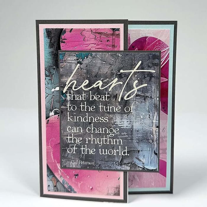 Crop the "hearts that beat" sentiment to fit the front of the card; mat with Dk. Gray.