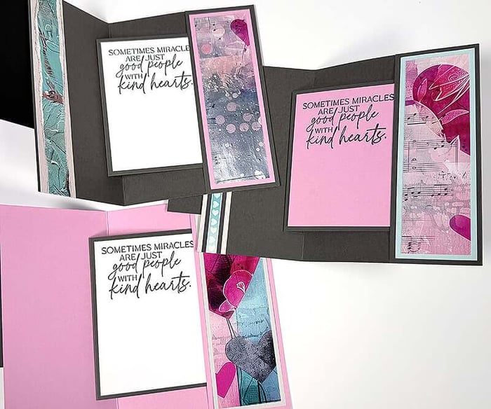 Stamp the "sometimes miracles" sentiment (Toile 09.25) with India ink onto the slider mechanism inside the last three cards.
