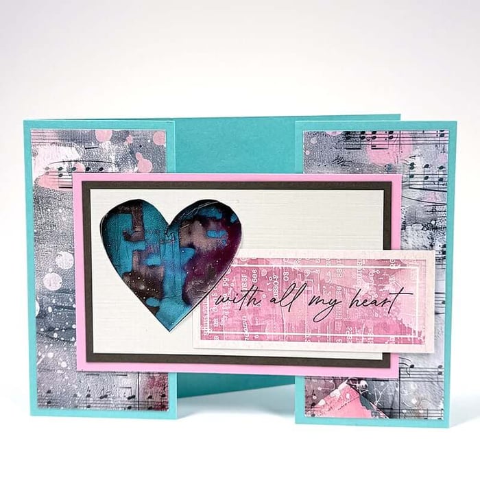 Cut the edges of the small heart cutapart with decorative scissors*; adhere to a stamped Aqua panel mat with Dk. Gray.