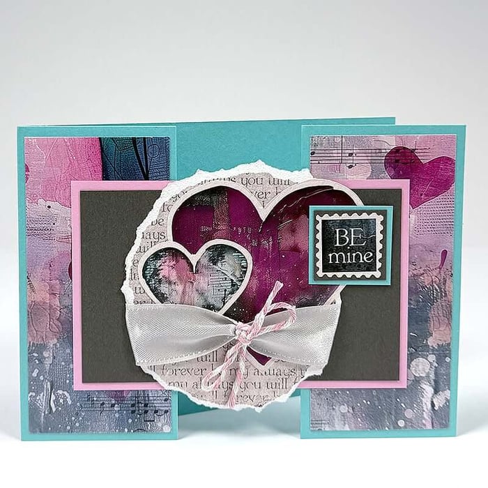 Tear the edges of the script cutapart to create a round element. Wrap with a length of Lt. Gray ribbon tied with a Baker's Twine bow. Top with two fussy-cut hearts. Crop the "be mine" cutapart with postage-edged scissors*; mat with Dk. Gray and Aqua scraps.