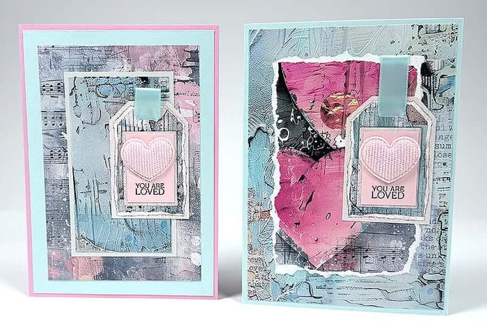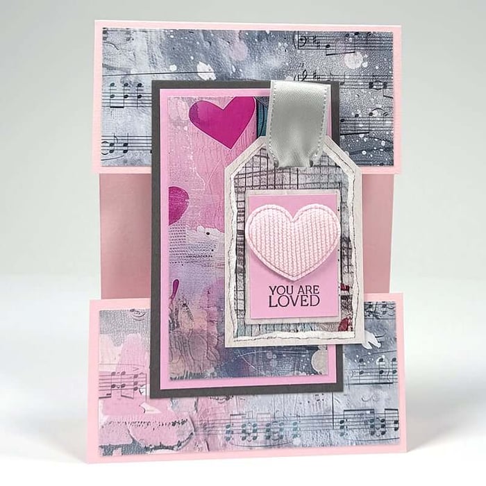 Embellish the top of a journaling tag with a Slot Punch and Lt. Gray ribbon. Trim Dk. Pink to 1.25x1.75"; stamp "you are loved" near the bottom with India ink. Adhere a puffy heart to the top of the panel and center onto the tag to cover the journaling lines.