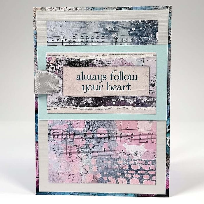 Cut the "always follow" strip at 4", thread Lt. Gray ribbon through an opening created with a Slot Punch. Center the be-ribboned sentiment onto the Lt. Blue panel adhered in a horizontal position.