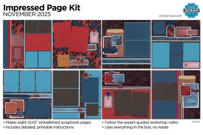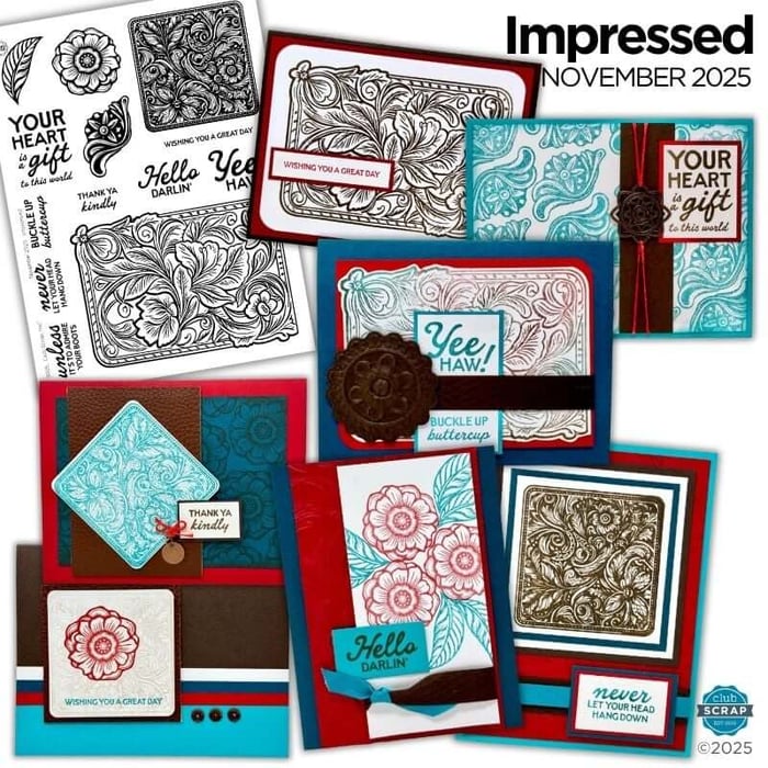 Introducing our November 2025 collection: Impressed. Featuring rich leather tones paired with gorgeous teal, this collection is sure to "impress"! Join us as we reveal all of the exciting things happening at Club Scrap throughout the month. If you prefer to be surprised, you might want to stop right here!