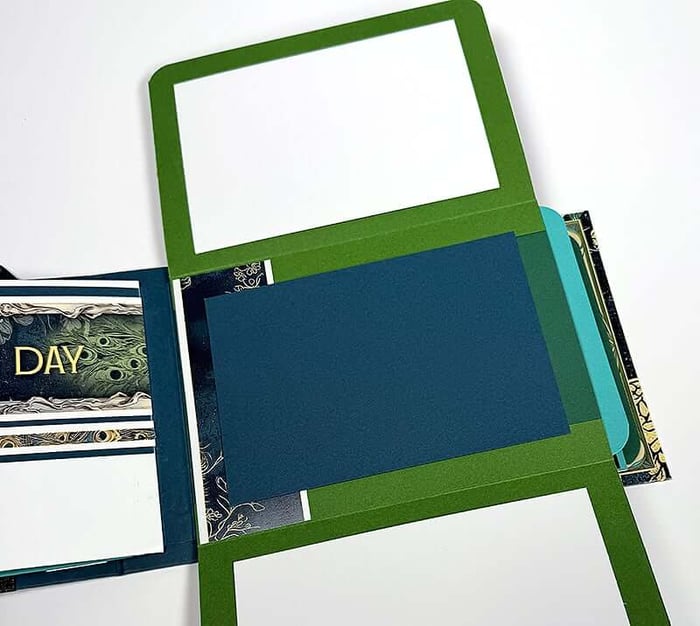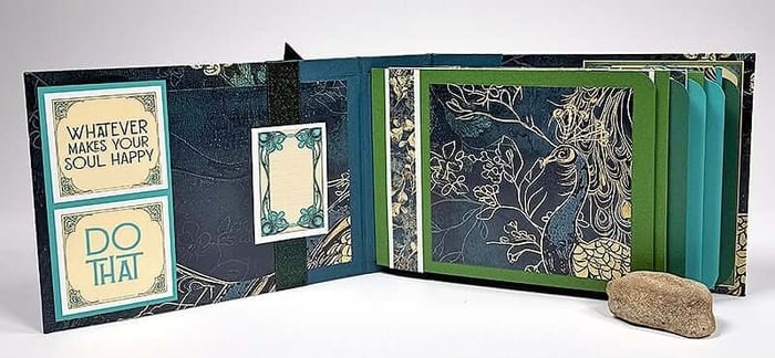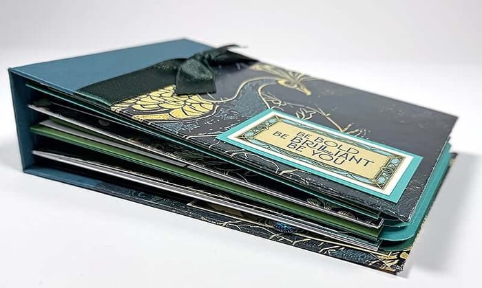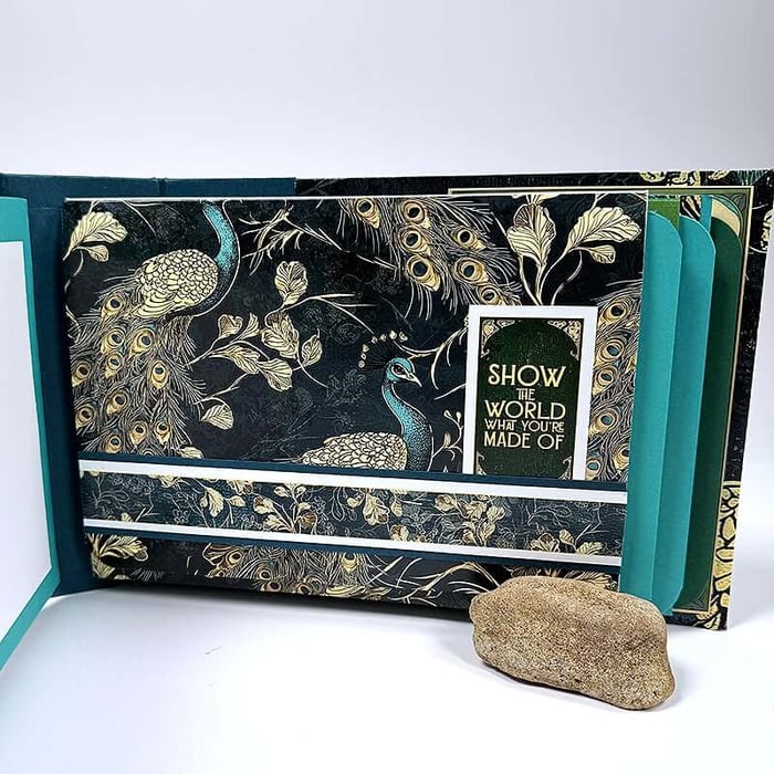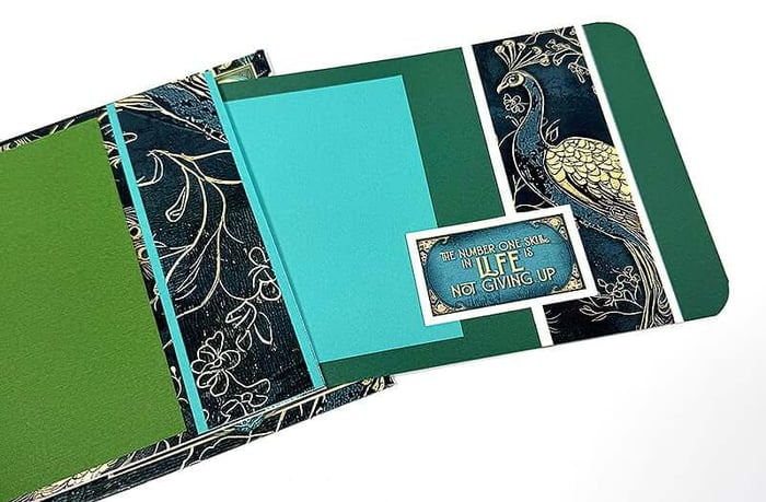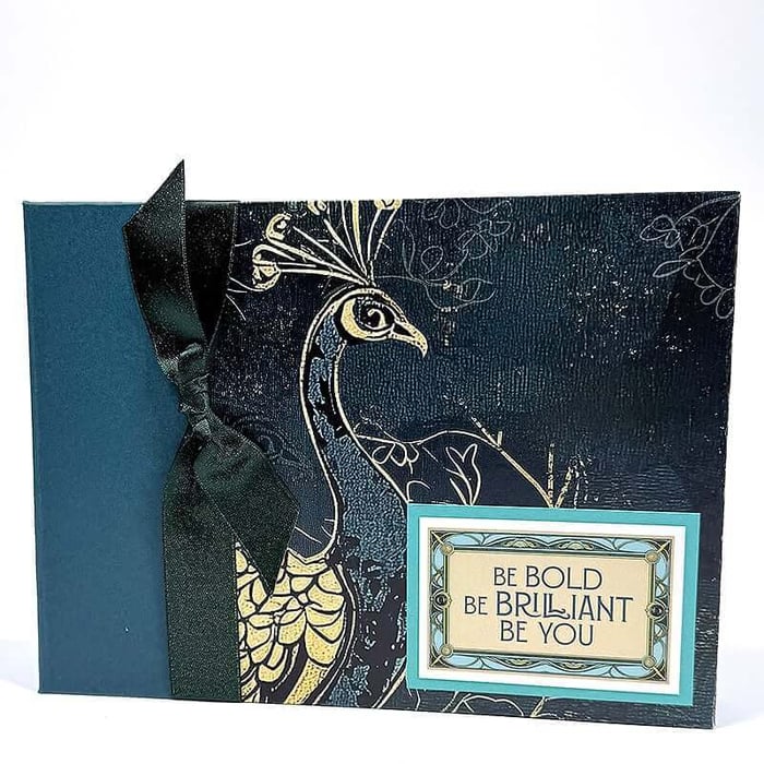 I chose the gorgeous Lg. Peacock Print for the covers. Accent with a favorite sentiment from the cutaparts included in the kit. Dark green metallic ribbon covers the seam where the two cover papers meet.