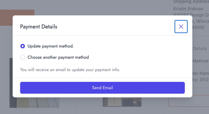 Click on "Edit". You can choose to update your payment or choose another payment method from this screen. Once the option is selected, click the purple/blue Send Email button. Be sure to check your spam/junk (or if using a gmail account PROMO tab) if you don't see the email in your inbox. If you still are unable to receive an email from our system, please call us and we will try and assist you. 888.634.9100