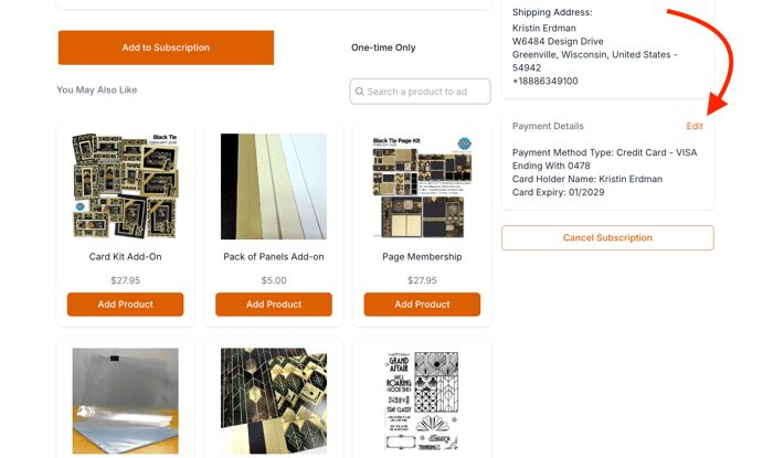 Scroll down to the right of the current subscription summary and locate the orange "Edit" next to the Payment Details.