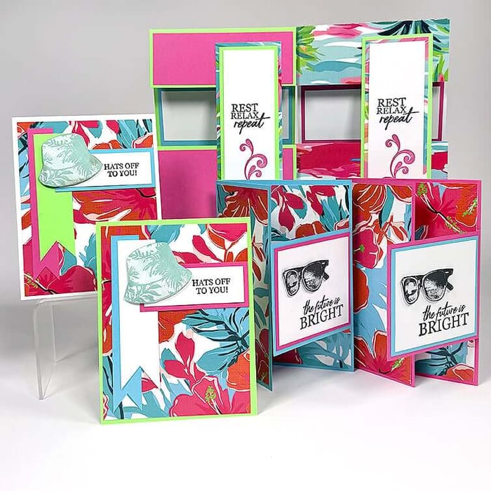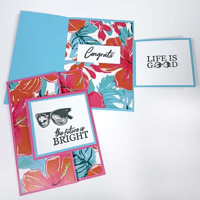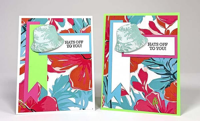 Since the prints in this collection are pretty bold, and the Palm Tree Print was trimmed to create card bases, I reversed the fold on the left card to avoid placing a print onto a print. Now the pretty artwork is on the inside, making it a fun surprise when the recipient opens the card.