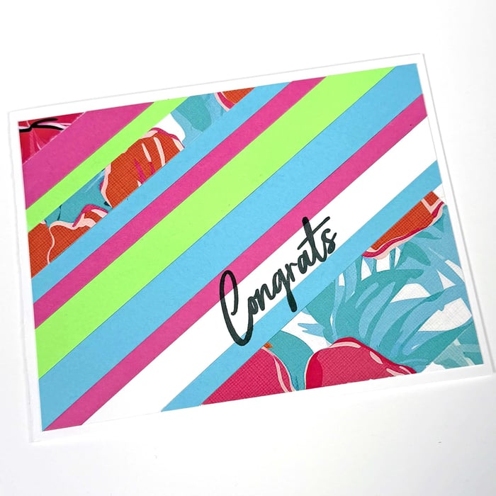 Add "Congrats" to the panel with India ink. Place the panel into a paper trimmer; cut approximately 1/8" from all four sides, or to the finished size of 4x5.25". Remove the backing, carefully center the panel sticky-side down, onto a prepared plain white card base.