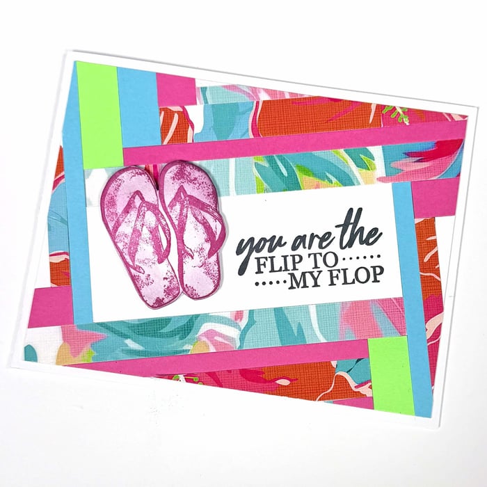 Trim the panel to 4x5.25". Stamp the sentiment onto the plain white center with India ink. Apply Fuchsia ink to the flip-flop image and stamp onto a scrap. Fussy cut the image and add to the panel with foam adhesive.