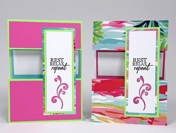Rather than reverse the fold on the Palm Tree Print card, I relocated the nesting panels (intended for the front of the card) to the inside. That way, the print really shines on the exterior, and the recipient will see a fun pop of color waiting inside the card.