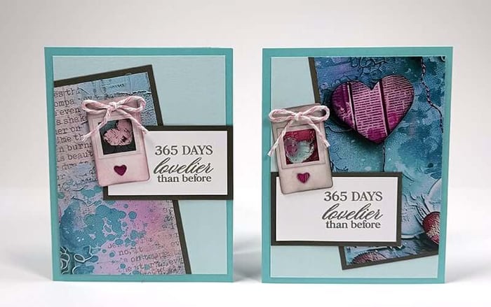 On the right, embellish the stamped panel with a heart-shaped cutapart; adhere with foam adhesive.