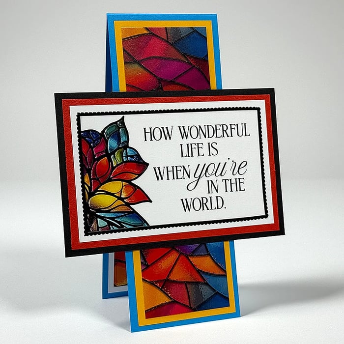 We love how Jacqueline created this clever stained glass frame with its very own "window" to showcase any of the sentiments on the sheet. The image is at the perfect scale for a standard sized card base with a few layering mats. Stamp and explore fun techniques with markers, embossing inks, ColorBursts, watercolors, and more! It's time to dust off all your art mediums and play. Julie got a head start and will share her inspiring ideas soon on the blog!