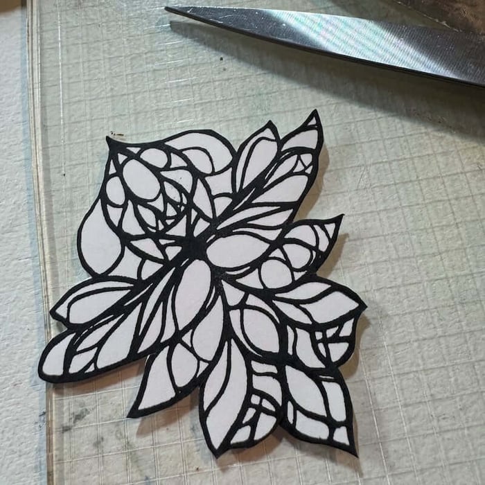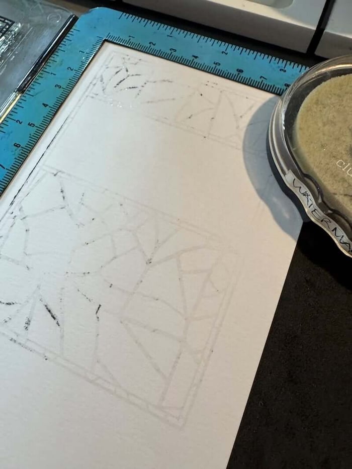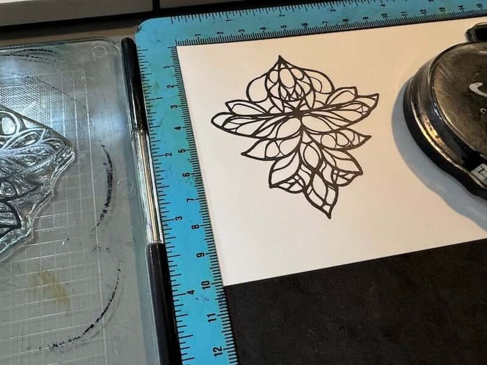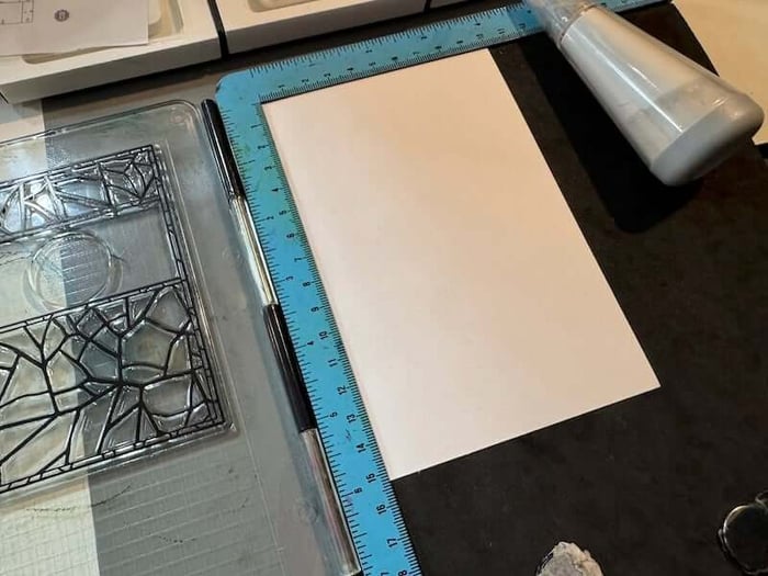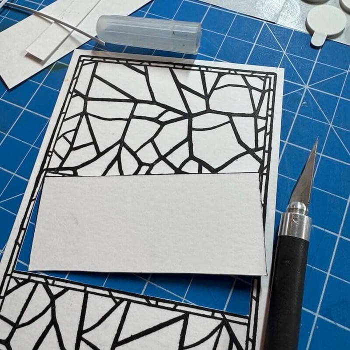 Trim the panel to 3-1/2x4-3/4" leaving an 1/8" reveal around the perimeter of the stamped image. Carefully remove the open area from the image with a craft knife and cutting mat.