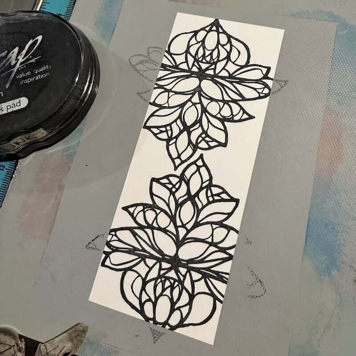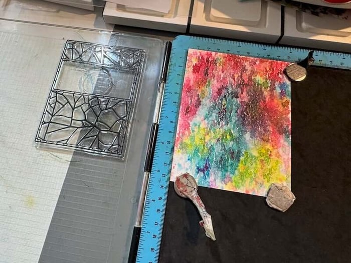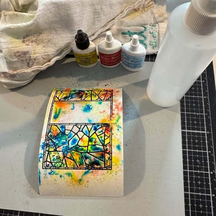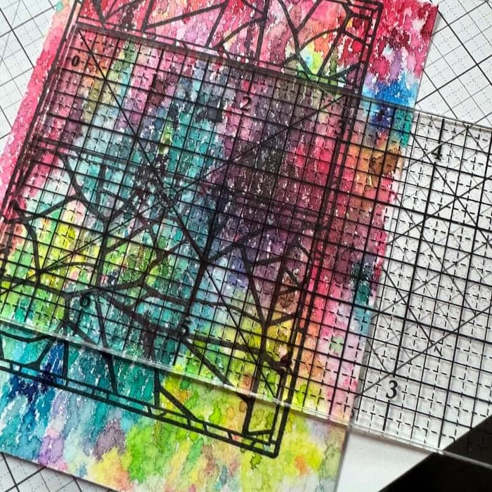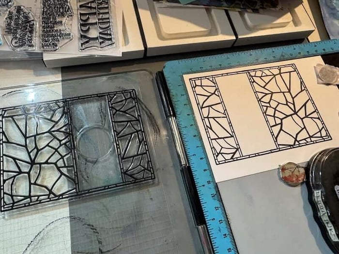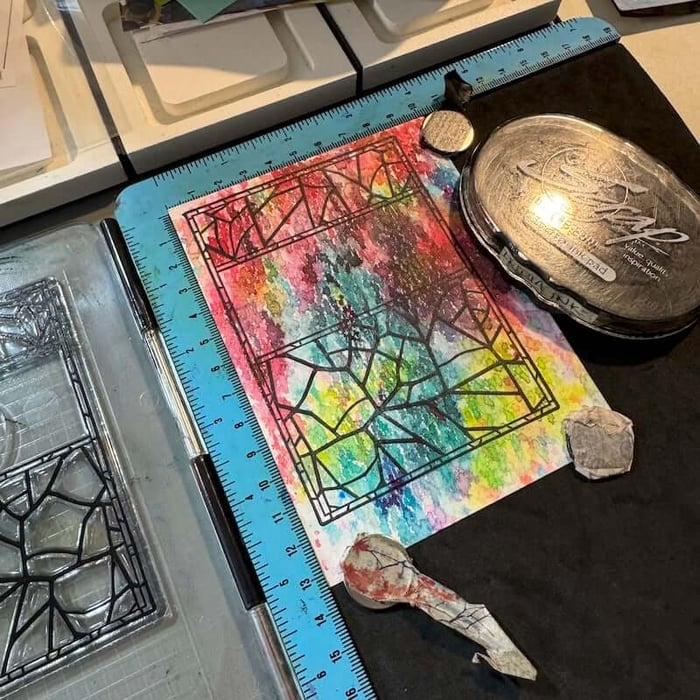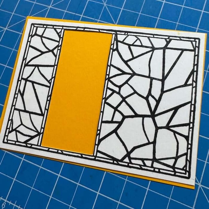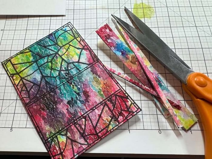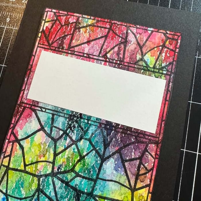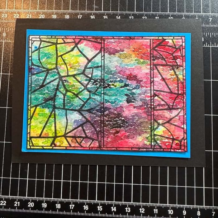 Stamp the stained glass window image onto the colored background panel with India Ink.