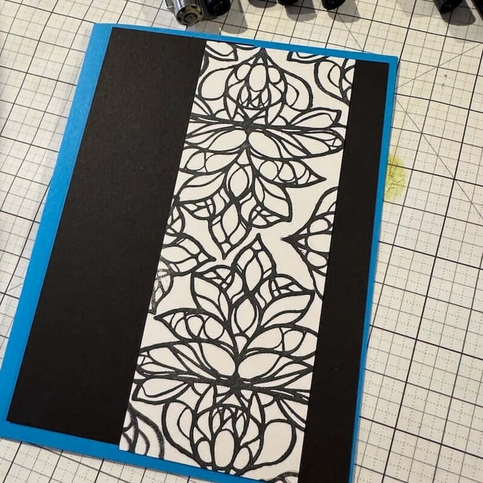 Nest the stamped panel onto a 3-3/4x5" Blue mat; center onto a Black card base.