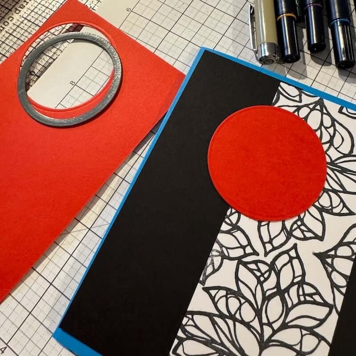 Adhere the panel to a 4x5-1/4" White mat and center onto a Red card base.