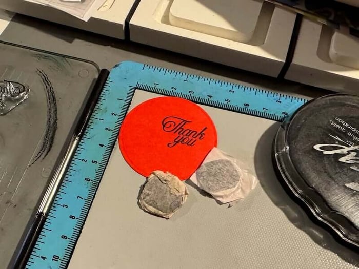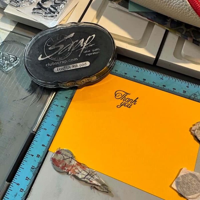 Stamp the Thank you sentiment with India Ink at the marked position on the Yellow panel.