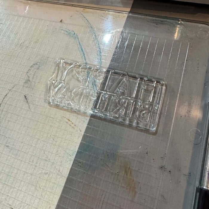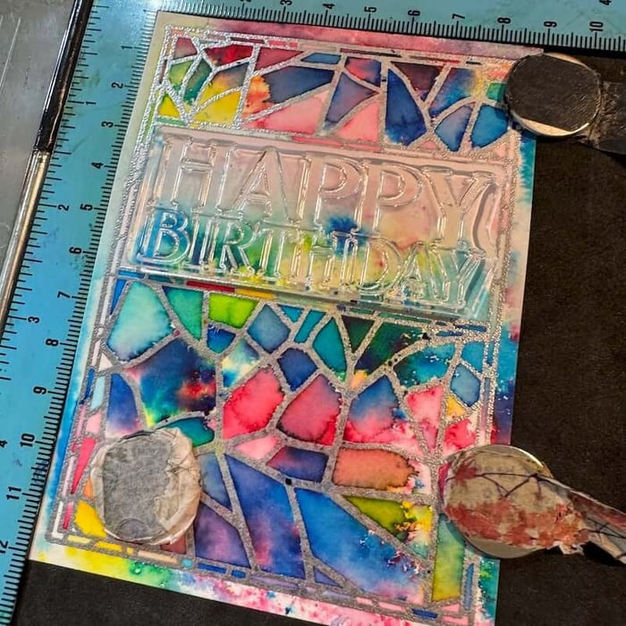 Trim the panel leaving an 1/8" reveal around the perimeter of the stamped image. Place the embossed panel into a stamping platform. Position the clear Happy Birthday sentiment within the open space.