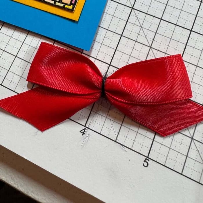Loop the ends of red satin ribbon and tie a piece of black jute around the middle to create a bow.