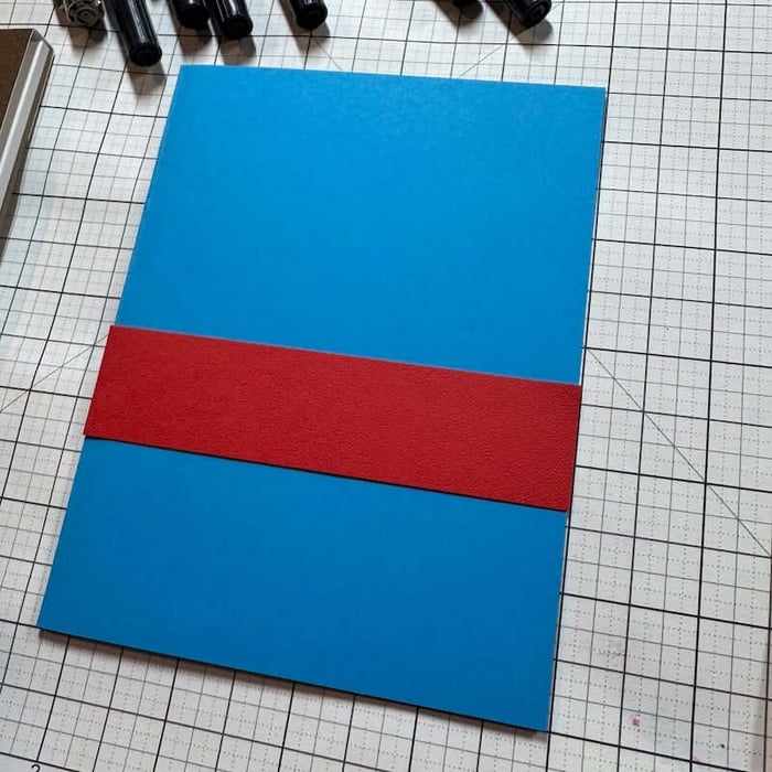 Adhere a 1x4-1/4" Red strip on a Blue folded card base.