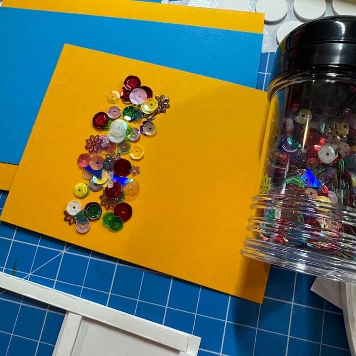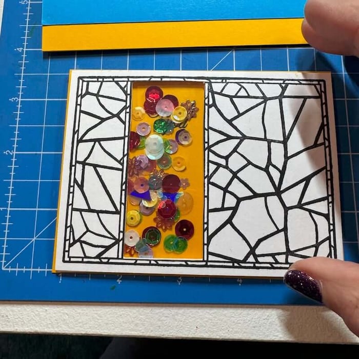Add a small pile of multi-colored sequins from your stash on the Yellow sentiment panel as shown.