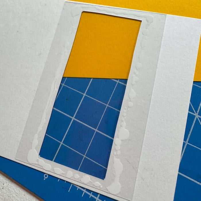 Gather a 3-3/4x5" Yellow panel and position under the stamped panel making note of where the window opening appears.