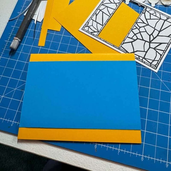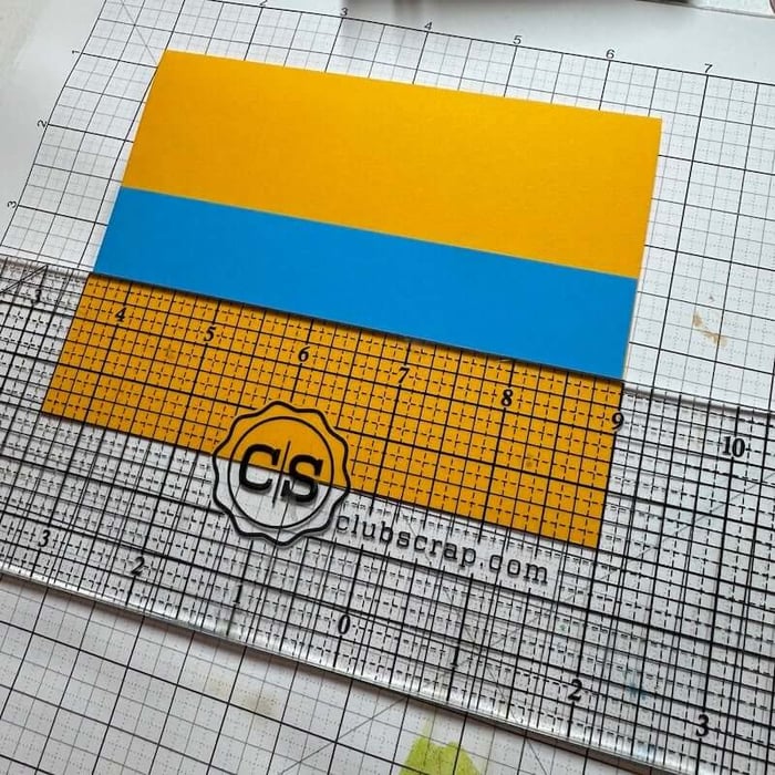 Position a 1x5-1/2" Blue strip onto a folded Yellow card base with a grid ruler.