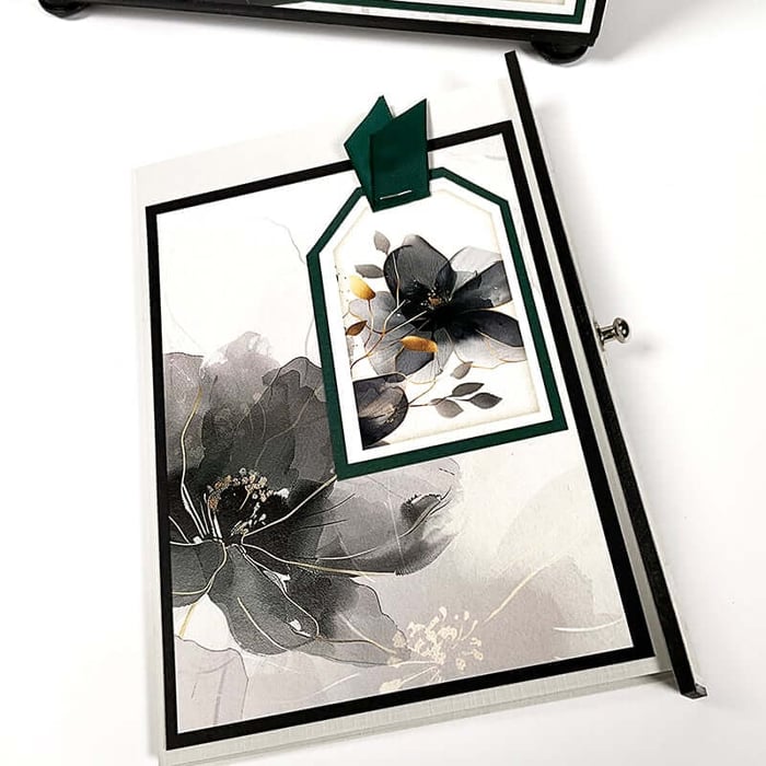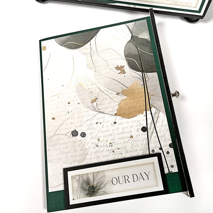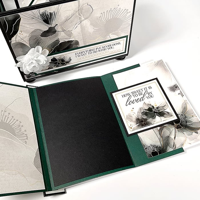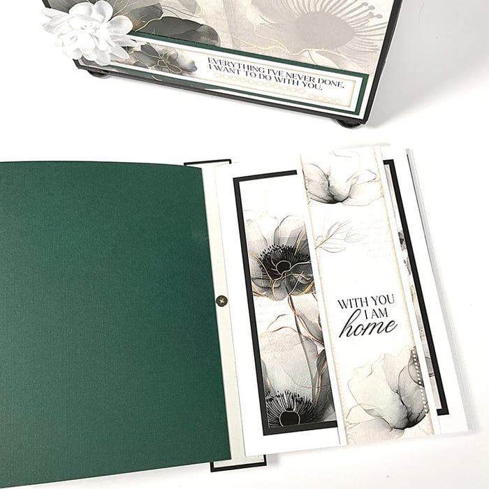 Add a 4.25x6.25 mat to each of the short flaps to maximize space for photos. Decorate the reverse side with border strips, sentiments and cutapart artwork.