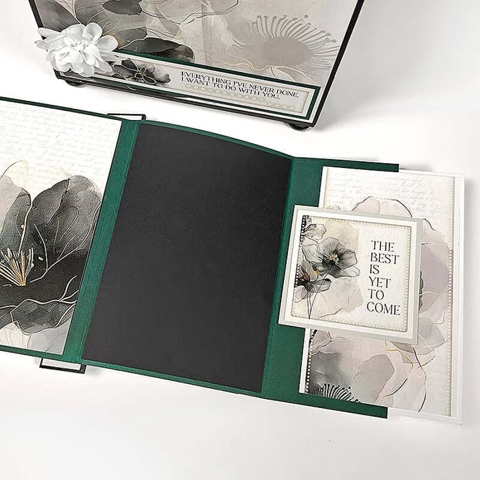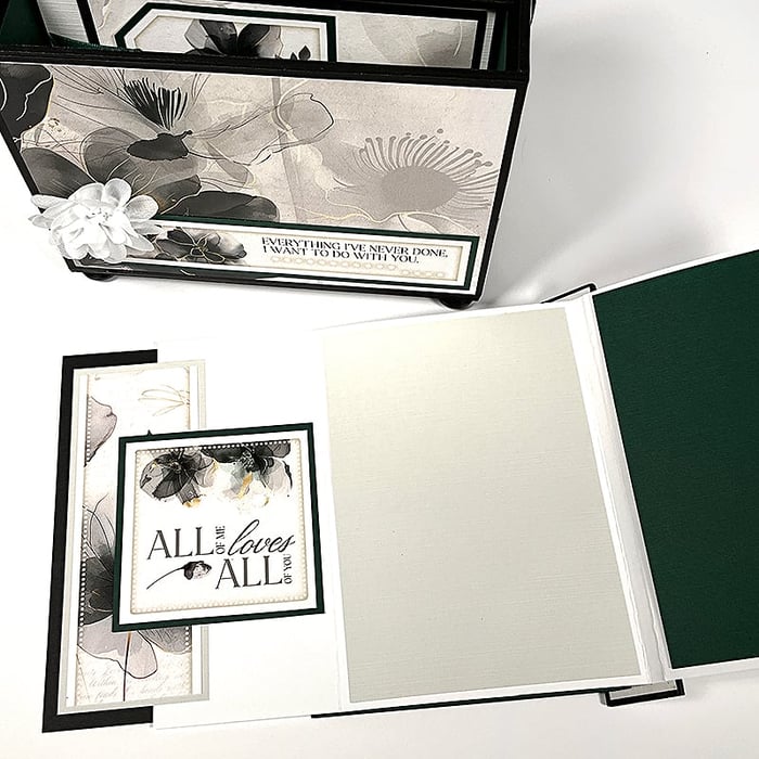 In the second video, you'll trim, sort and score the papers. Once the papers are trimmed, you'll wrap the box and decorate with the cut panels. Finally, you'll assemble the inside pages and adhere them to the book spines.